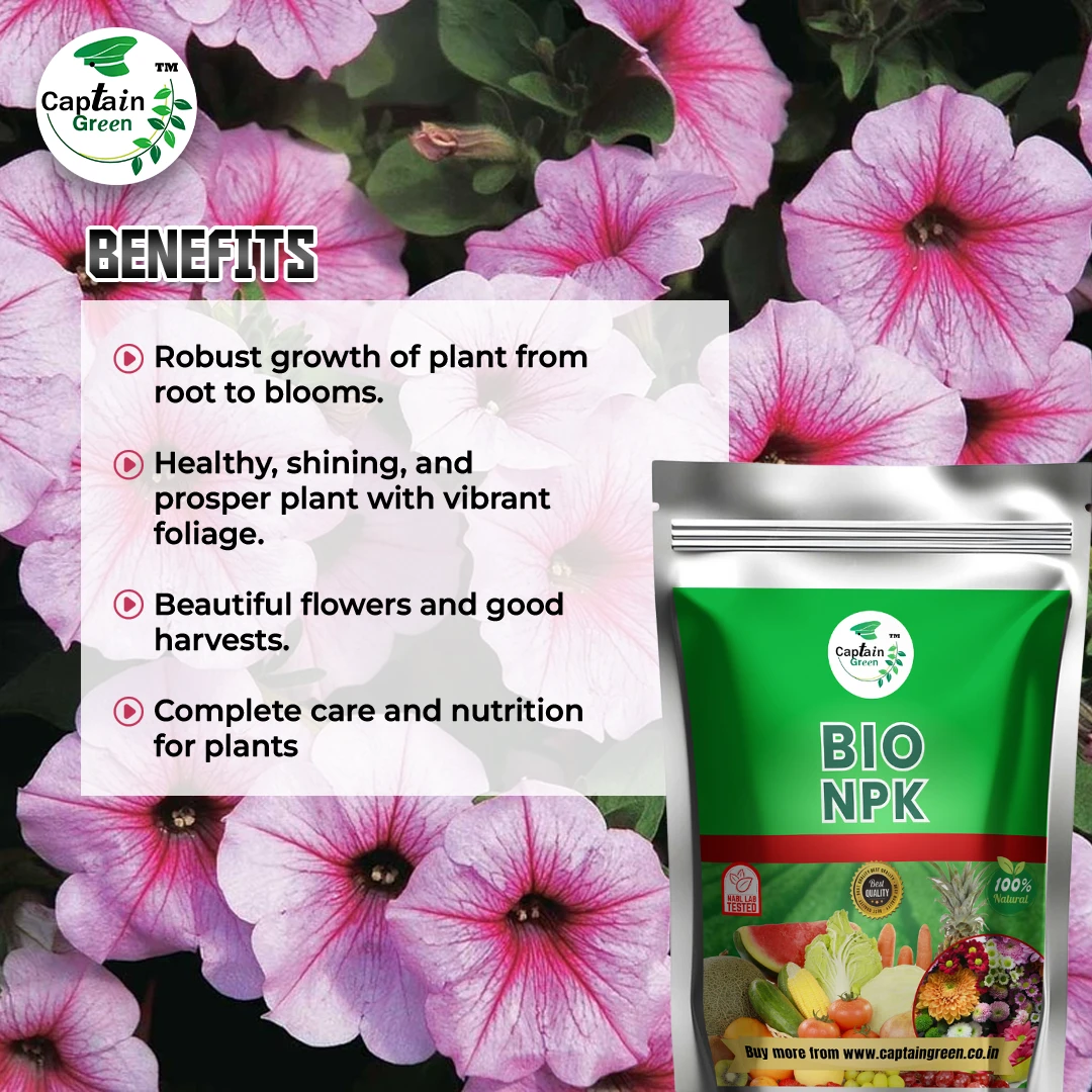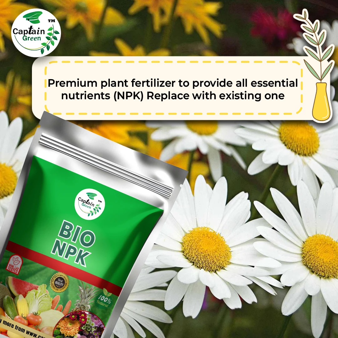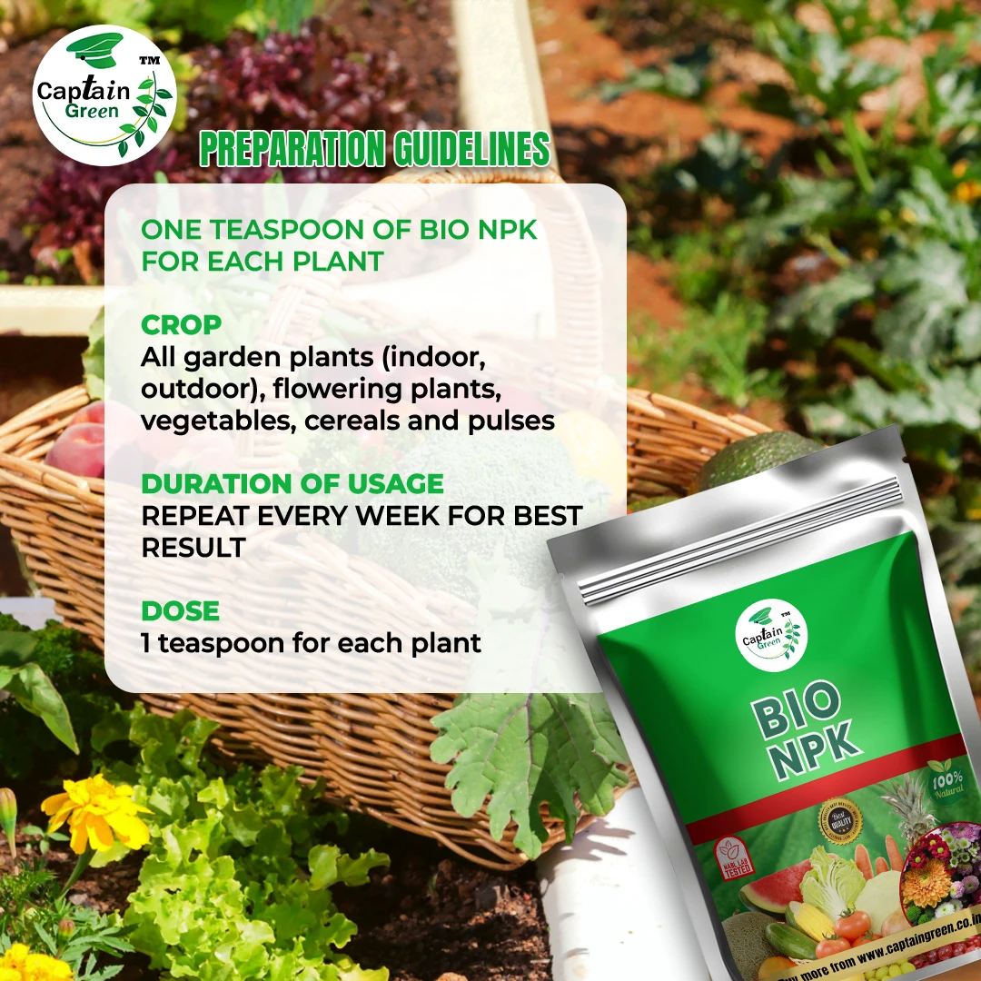 Captain green Bio NPK (Organic fertilizer) provides complete care and nutrition for plant, ensuring robust growth from roots to blooms. It promotes healthy, vibrant foliage, beautiful flowers and a bountiful harvest, supporting plants’ overall health and vitality with natural nutrients.